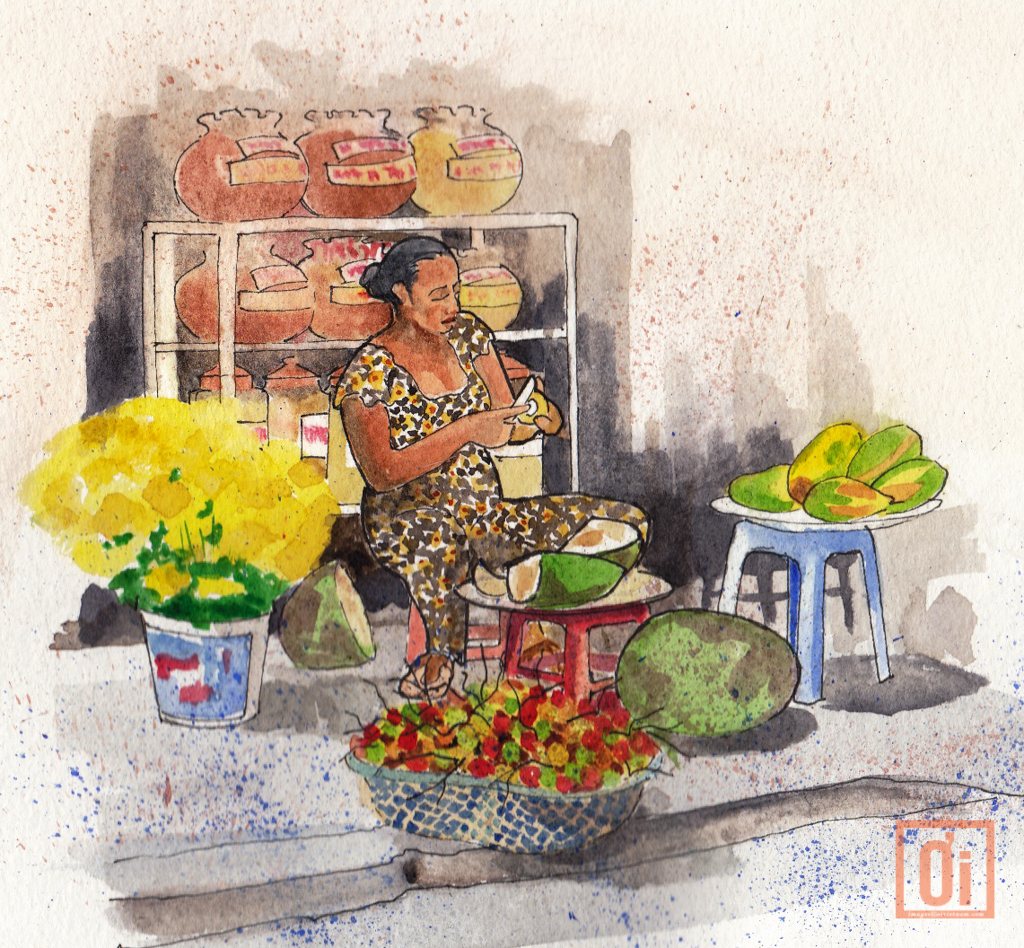 On any given day, you might find a silver-haired British woman leaning against her bicycle on one of Vietnam’s back alleys, a point-and-shoot and a set of watercolors tucked into her bag, feverishly sketching in her Japanese Moleskin notebook a scene of a Chinese shopfront in Cho lon or a woman preparing jackfruit in a market in hoi An.