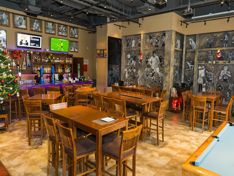 Tearing a page out of Nike’s hugely successful “Bo Knows” campaign (featuring Bo Jackson who played professional baseball and football in the same year), The Fan Club knows entertainment. Owned by DTD Entertainment and set up by Director Barry Winters whose list of accomplishments include Creative Director for Dancing With the Stars (Thailand) and Chief Designer for an interior design company, The Fan Club brings sports entertainment to a new league, from the Vegas-inspired custom feature wall sporting more than 8,500 angled wood bricks to the hand-painted portraits of dozens of entertainment icons spanning the decades ranging from Serena Williams and Larry Bird to Dita Von Teese and Frank Sinatra.