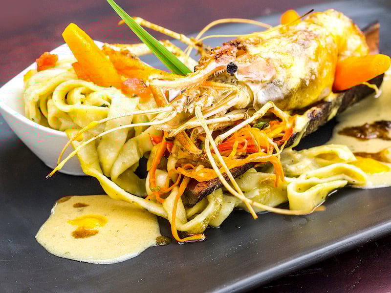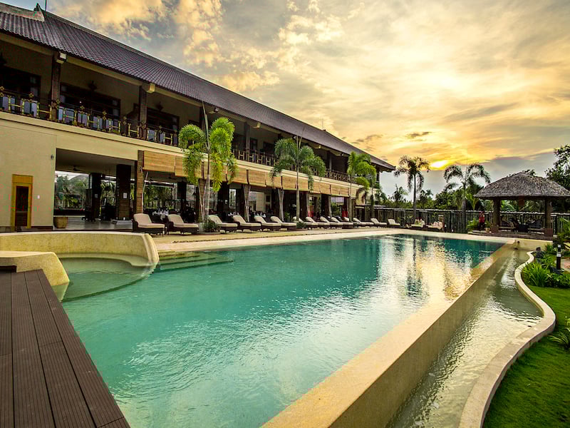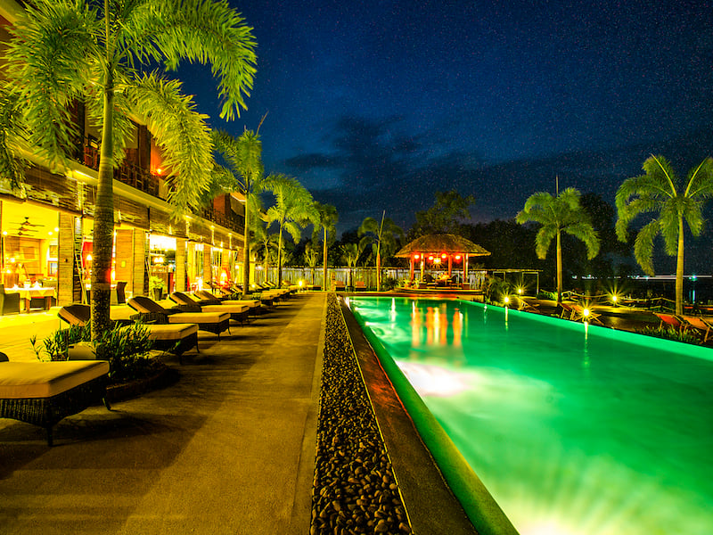 The result is a stunning oasis of refined charm on Unicorn Island, one of the many river islets in the area. Set five kilometers off the main road, an unremarkably pretty country lane edged by coconut palms and banana trees suddenly opens onto a ridiculously gorgeous property with fastidiously manicured gardens featuring lotus ponds, gazebos and a waterfall. A few bungalows are scattered around the grounds, but the jewel of the lodge is the open air restaurant/lounge set on 50 meters of riverfront.