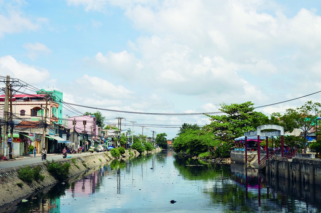 We shake hands in the small yard in front of her door. Through an alleyway I walk back to my motorbike, which I had parked on the main road. I cross two bridges that take me to the Tau Hu Canal, the former Chinese river, which was also known as the ‘rice street’ of Saigon as it was the most important trade route between the Chinese river harbour in Cholon and the French sea harbour in Saigon. As I am driving past it, I see small houses with shops on the streets on both sides. On the left sides they are two stories high, old and derelict; on the right side, they are five stories high, new, and so colourful they form a nice contrast with the black canal. They remind me of the grachtenpanden — canal houses — of Dutch water cities. I drive past the Chinese district, Cholon, and when the Hau Tu Canal changes into a winding river — a sign I am approaching the Mekong Delta — I turn right and follow the Lo Gom Canal. I can see the water tower in the distance. That is where I need to be.