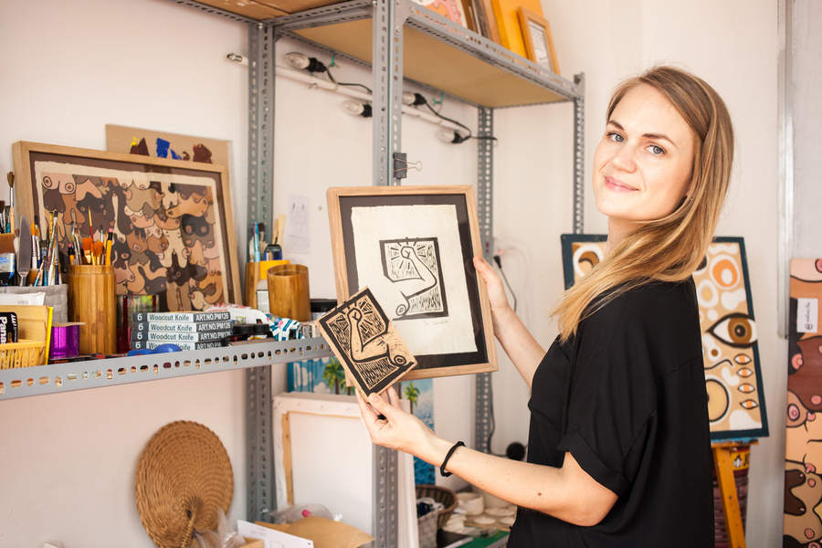 Holt is a freelance artist and designer whose work record includes interior and industrial design, textiles, pottery, prints, painting and furniture. She arrived in Vietnam in 2014 as part of a work agreement with furniture maker UMA. She handles lots of deadline centered work like the illustrations she was assigned in summer 2016. She remembers reaching a point where the work wasn’t coming and all she could feel was the pressure. Her body was stiff and she was feeling unhappy. “It doesn’t release my creativity just to sit like this,� she reasons. “I was just loosening up and doing what I like instead. It just came to [drawing] some naked, dancing people having fun. It was such a relief. It just came as so natural.�